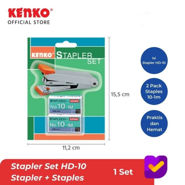 Item size: 15,5 cm x 2,5 cm x 11,2 cm Weight : 115 gram / pcs Isi : 1 Buah Stapler HD-10, 2 Buah Staples no 10-1m
