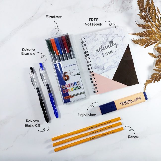 Terdiri dari : 2 buah pensil 2B, 1 buah rautan, 1 penghapus, 1 pulpen biru 1 tempat pensil (FREE) 1 highlighter warna random 1 triplus fineliner