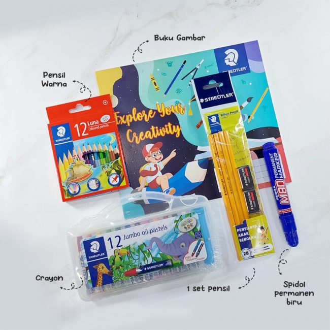 Isi : 1 Pcs Buku Gambar 1 Pcs Pensil Warna Pendek isi 12 Warna 1 Pcs Crayon Jumbo Oil Pastel 1 Set Pensil plus Penghapus 1 Spidol Permanent