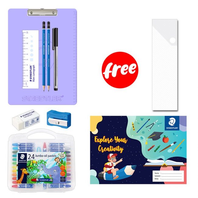 1 pcs Papan Jalan 2 pcs Pensil Mars Lumograph 2B 1 pcs Luna Ballpoint Pen 1 pcs Penghapus B40 1 pcs Rautan single hole kotak kecil 1 pcs Penggaris 10cm (ada tanda centang, bulat, dan silang) 1pack Jumbo Oil Pastel isi 24 FREE Kotak Pensil Plastik FREE Buku Gambar